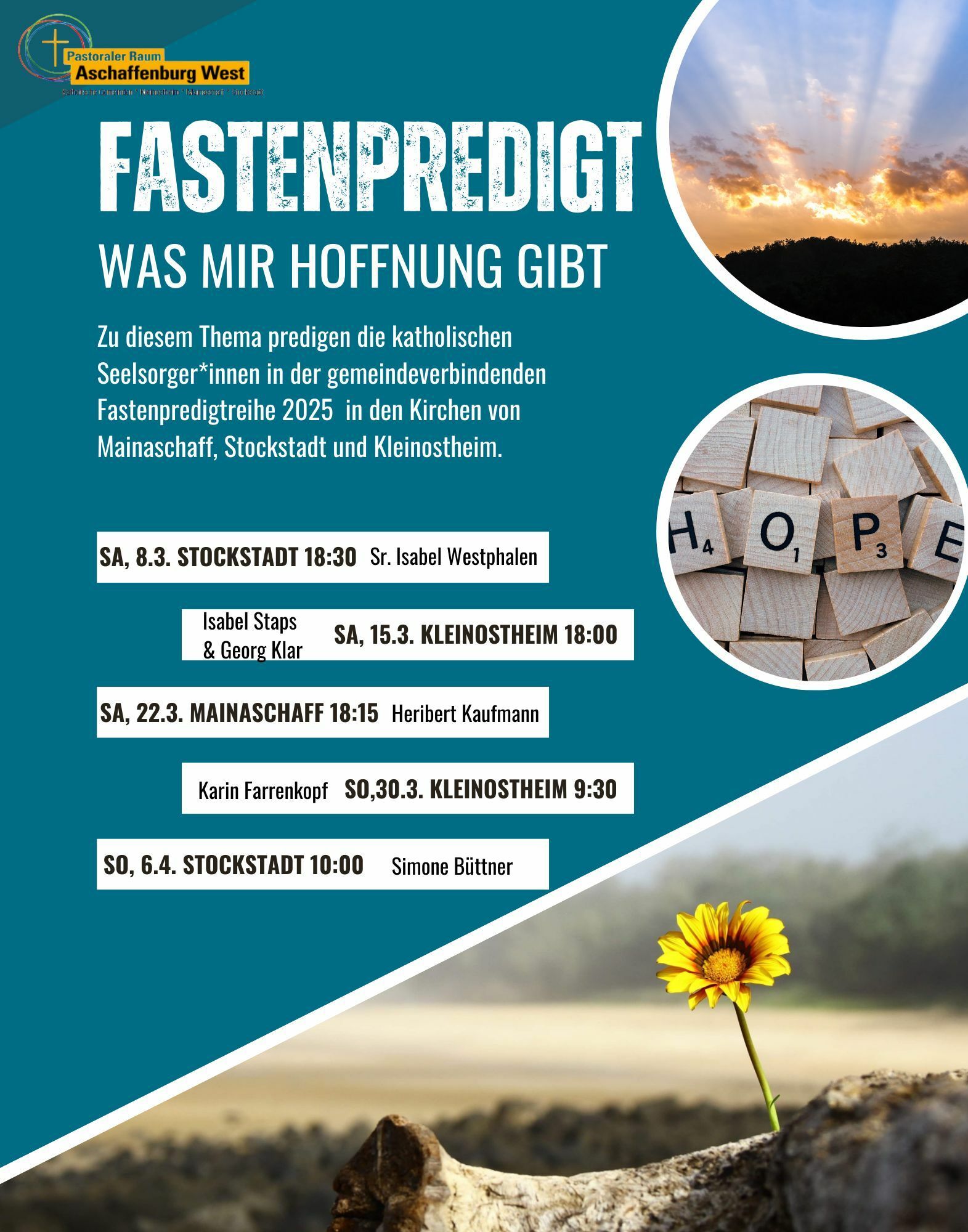 Was mir HOFFNUNG gibt Zu diesem Thema predigen die katholischen Seelsorger*innen in der gemeindeverbindenden Fastenpredigtreihe 2025 in den Kirchen Kleinostheim, Mainaschaff und Stockstadt. Sonntag, 6. April, 10.00 Uhr: Simone Büttner