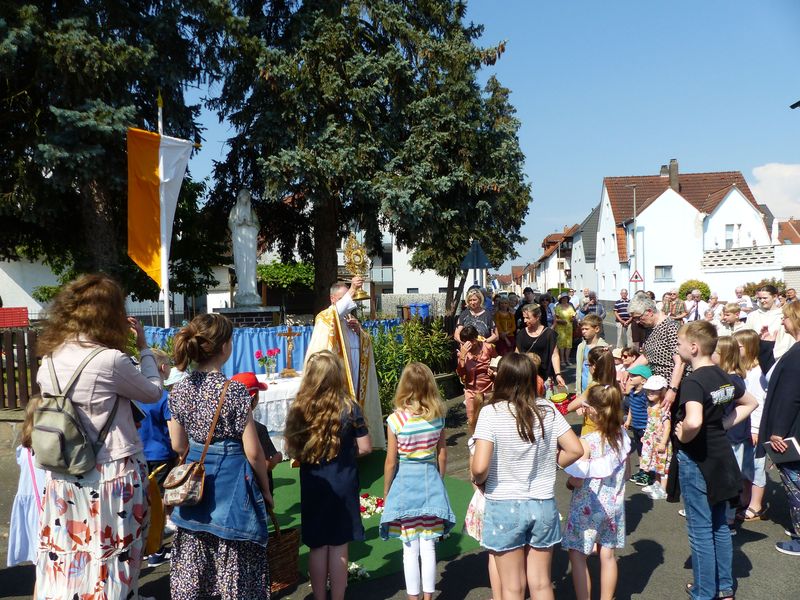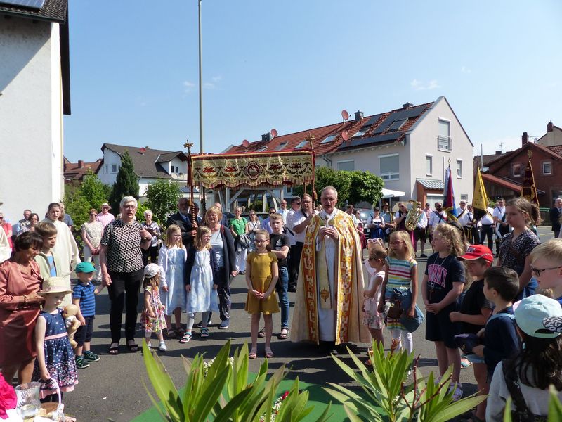 Die anschließende Prozession führte vom Kirchplatz über die Schillerstraße, Bahnhofstraße, Goethestraße zurück zum Kirchplatz. Viele Anwohner hatten ihre Häuser geschmückt und es waren wunderschöne Altäre zu sehen. Vielen Dank dafür! Viele Kinder waren mit auf dem Weg und streuten Blumen. Am 2. Altar lud Pfarrer Kaufmann die Kinder ein, nach vorne zum Altar zu kommen, um sich die Montranz näher anzuschauen. Gemeinsam sangen sie dann das Lied der Kommunionkinder: “Dieses kleine Stück Brot in unseren Händen”.