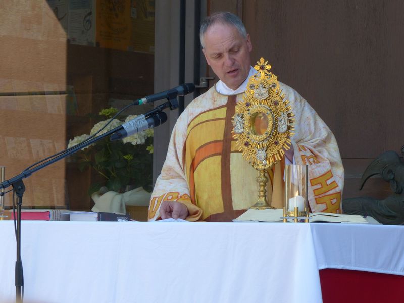 Bei schönstem Wetter hatten sich ca. 300 Gottesdienstbesucher auf dem Kirchplatz eingefunden, um gemeinsam den Gottesdienst zu feiern. In seiner Predigt wies Pfarrer Kaufmann auf die Monstranz hin, die mit ihrem kleinen “Schaufenster” uns Gottes Anwesenheit zeigt.