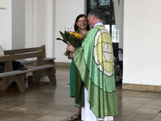 gratulierte Pfarrer Kaufmann der Chorleiterin Angela Jansen am Ende des Gottesdienstes.