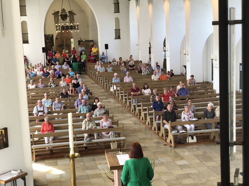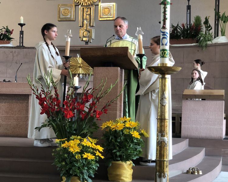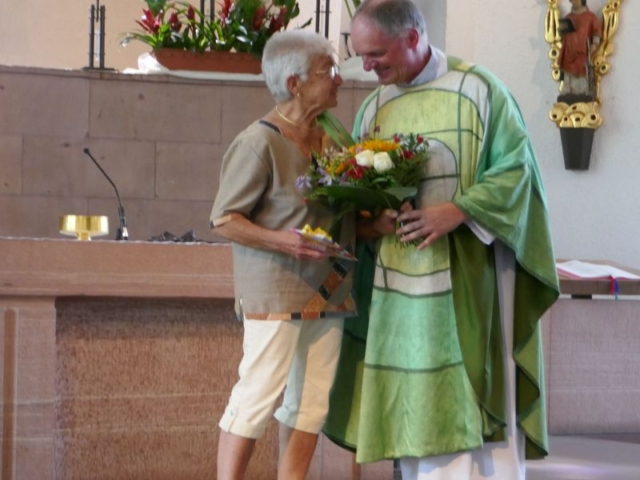 Der Festgottesdienst, der am Sonntag um 10.00 Uhr begann, wurde vom Kirchenchor musikalisch untermalt. Pfarrer Kaufmann verabschiedete Frau Elisabeth Watzl in diesem Gottesdienst aus ihrer ehrenamtlichen Tätigkeit als Leiterin des Blumenschmuckteams und bedankte sich für ihren rund 30-jährigen Einsatz für die Gemeinde.