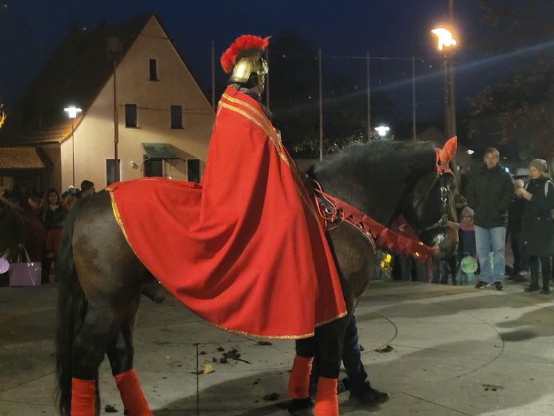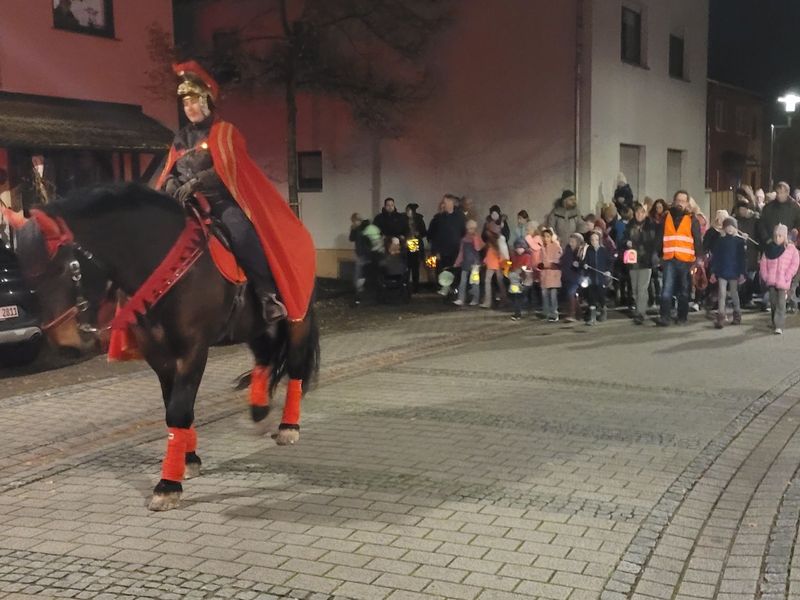 Danach zogen alle mit ihren Laternen hinter einem echten Pferd, auf dem Martin mit seinem roten Mantel saß, rund um die Kirche. Danke der Feuerwehr für die Absperrung.