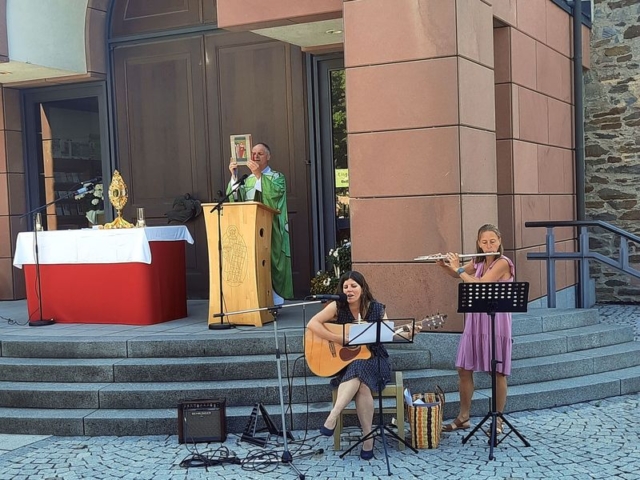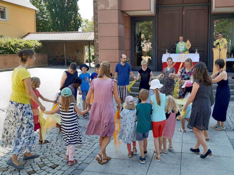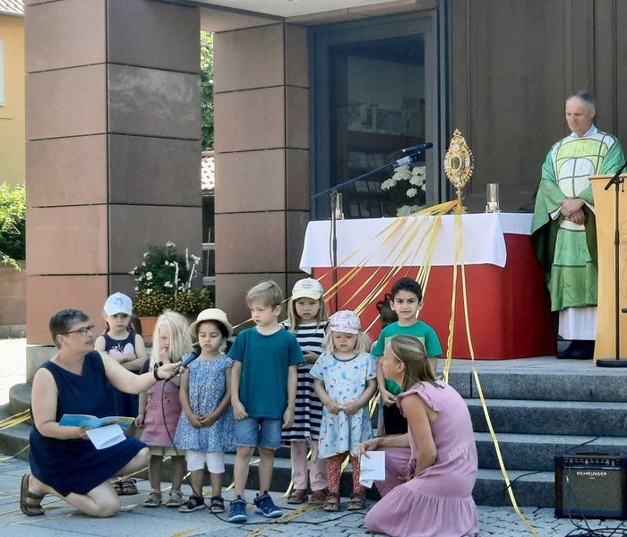 “Gottes Liebe ist wie die Sonne” – das Motto wurde auf vielfache Weise umgesetzt. Nina Bauer und Simone Krenz sorgten für eine mitreißende musikalische Gestaltung. Die Kindergartenkinder steuerten ein Sonnenlied bei. Alle Kinder wickelten an der Strahlenmonstranz befestigte Sonnenstrahlen aus und legten sie behutsam auf den Boden. Mit einem Sonnentanz fand der lebendige Gottesdienst, den das Familiengottesdienstteam mit Pfarrer Kaufmann vorbereitet hatte, seinen Abschluss. Beim anschließenden Kirchturmcafe war Gelegenheit zur Begegnung und zum Austausch.