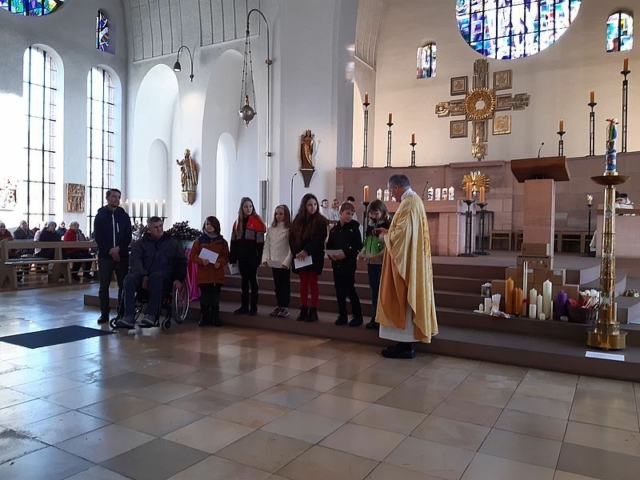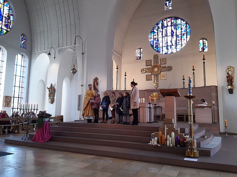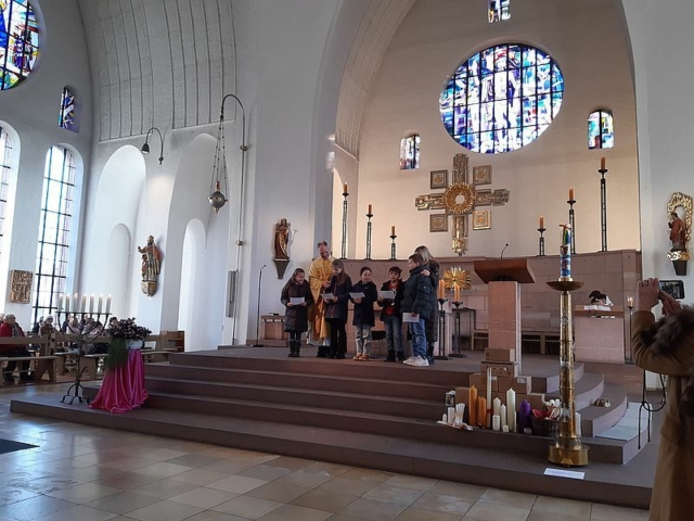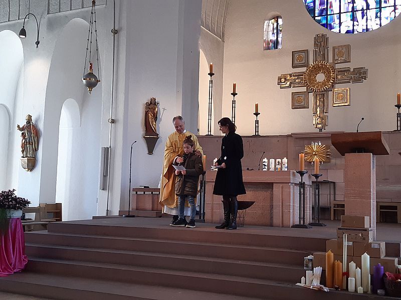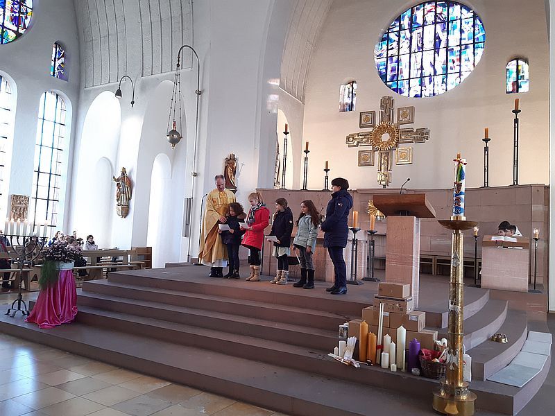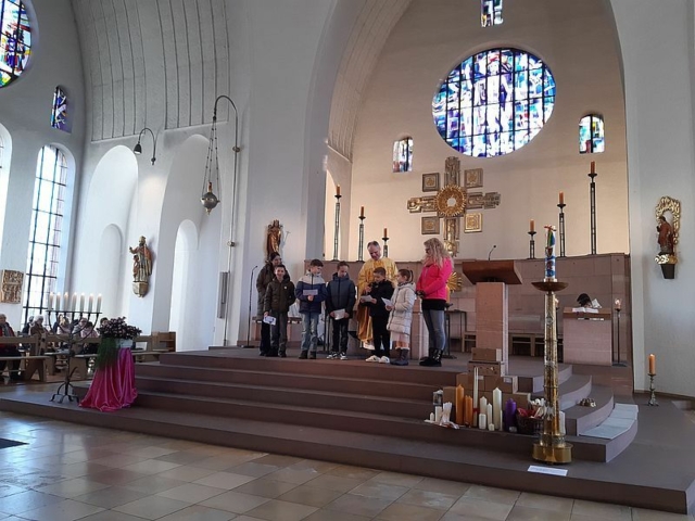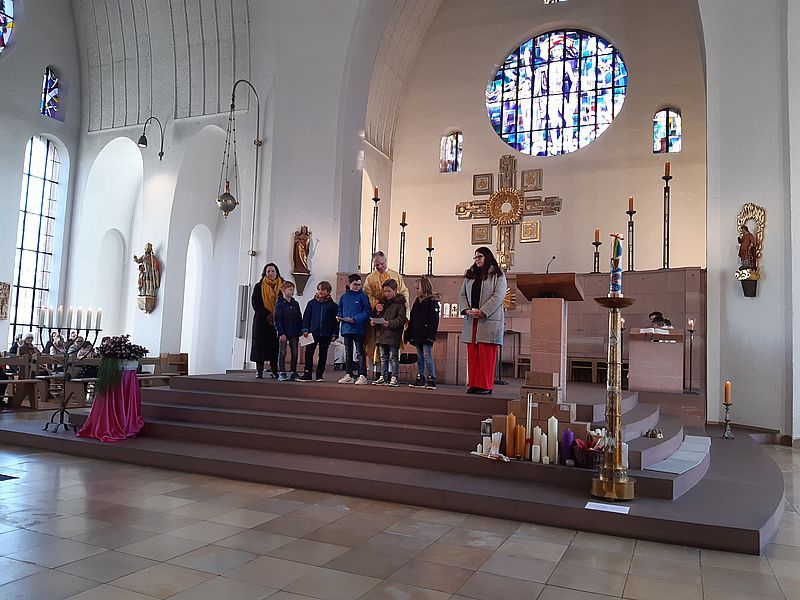 Im Anschluss konnten sich die Gottesdienstbesucher eine Gebetspatenschaftskarte mit nach Hause nehmen, auf der ein Gebet und der Name eines Kommunionkindes steht. Mit dieser Gebetspatenschaft bitten die Kinder um das begleitende Gebet auf ihrem Weg zur Erstkommunion.