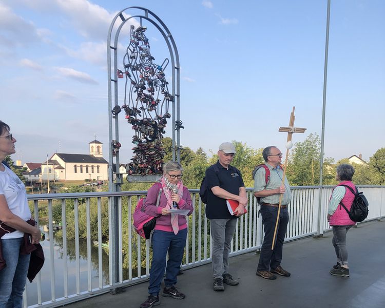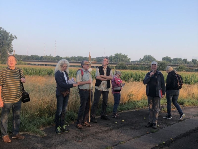 Weiter führte uns der Weg an Feldern und Fluren vorbei. Auf der Mainbrücke in Mainflingen machten wir unseren zweiten Stopp. Auch an dieser Station brachte Yvonne Gruber ihre Gedanken zum Thema „Zeit“ vor. In der Kirche in Kleinwelzheim angekommen, hielt Hartmut Adler nochmals eine kurze Impulsandacht. Nach einer 20-minütige Pause brachen wir dann zur letzten Wegetappe in Richtung Seligenstadt auf.
